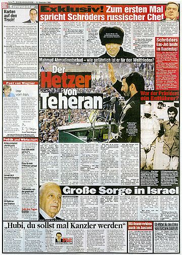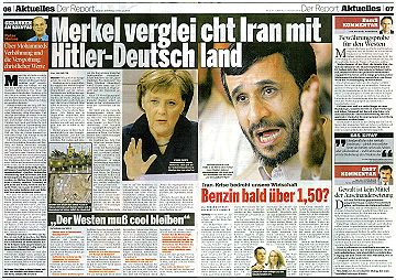 Aus dem Artikel 'Der Hetzer von Teheran': "...er ist der gefährlichste Mann der Welt. Er will Israel auslöschen. Das sind keine hohlen Phrasen mehr. Je intensiver er seine Vernichtungsphantasien verbreitet, desto fanatischer wird sein Volk. Die Welt kann sich nicht länger damit trösten, mit Diplomatie sei noch etwas zu erreichen. Nein, Ahmadinedschad will Kontroverse bis hin zum Krieg. Ist in der Millionenmetropole Teheran ein neuer Adolf Hitler erstanden? Auch der Nazi-Verbrecher wurde jahrelang belächelt. Auch seine Hetze gegen die Juden nahm zunächst niemand ernst."