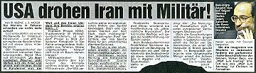 Aus dem Artikel 'Rückt die Kriegs-Gefahr immer näher?': "ER hetzt gegen Amerika und die Juden, will Israel 'von der Landkarte wischen'! Er baut an der Atombombe und will den Westen mit einem Öl- und Wirtschaftsboykott erpressen! Die ganze Welt fragt sich: Treibt Irans Präsident Mahmud Ahmadinedschad uns in einen neuen Krieg? [...] 'Es darf nicht so weit kommen, daß der Iran freie Staaten erpressen kann', warnt US-Präsident Goerge W. Bush. Die US-Armee hat längst Pläne für einen Militärschlag gegen das Regime in Teheran entworfen. Die Bush-Regierung setzt aber zunächst auf Sanktionen des UN-Sicherheitsrates. Israel, das im Fall einer iranischen Atombombe mit seiner völligen Vernichtung rechnen muß, zeigt sich weniger geduldig. Israelische Jagdbomber trainieren seit Monaten den gezielten Beschuß iranischer Atomanlagen. Ein Modell der Nuklearfabrik Natanz südlich von Teheran wurde dafür eigens in der israelischen Negev-Wüste nachgebaut, berichten Experten des britischen Geheimdienstes. 'Wir werden iranische Nuklearwaffen nicht akzeptieren', warnte Verteidigungsminister Schaul Mofas. Sein Land sei darauf vorbereitet, sich zu verteidigen..."