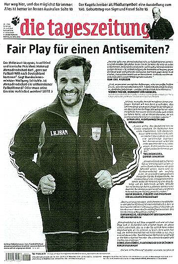 Der Irre von Washington Mit der 'taz' in Konkurrenz tritt die Bild-Zeitung. Sie kommt dabei allerdings nur auf den zweiten Platz. Denn bei ihr schafft es das Thema nur auf Seite 2. Dafür formuliert sie plumper. Im Kommentar der Bild-Zeitung heißt es unter dem Titel 'Er ist kein Freund!': "Das Motto der Fußball-WM lautet: 'Die Welt zu Gast bei Freunden'. Alle freuen sich auf das friedliche Fest der Völker hier bei uns. Und jeder ist herzlich willkommen – bloß einer nicht: Irans Präsident Mahmud Ahmadinedschad! Solange der 'Irre von Teheran' den Holocaust leugnet, an der Atombombe bastelt und den Terror unterstützt, soll er zu Hause bleiben." Auch sie schafft es spielend - wie die 'taz' - die Bedrohungssituation umzukehren. Wie einfach wäre es zu schreiben: Solange der 'Irre von Washington' den Holocaust instrumentalisiert, seine Atombomben im Iran zum Einsatz bringen will und die Welt mit Terror überzieht, soll er zu Hause bleiben. Und es wäre noch dazu um einiges richtiger.