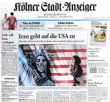 "Iran geht auf die USA zu", lesen wir auf der Titelseite des Kölner Stadt-Anzeiger. Am Morgen des Montag, dem 8.5.2006, war bekannt geworden: Der iranische Präsident Mahmud Ahmadinedschad hat dem US-Präsidenten George W. Bush geschrieben. Das ist der erste Brief eines iranischen an einen US-amerikanischen Präsidenten seit 1979, als es zum Abbruch der diplomatischen Beziehungen zwischen den beiden Staaten kam. US-Außenministerin Condoleezza Rice weist den Brief des iranischen Präsidenten Mahmud Ahmadinedschad als "nutzlos" zurück. Und Israel reagiert mit der Bemerkung seines Vize-Premiers Schimon Peres - in dem Wissen, daß Irans Präsident eine entsprechende, gegen Israel gerichtete Aussage nicht getätigt hat - der Präsident des Iran solle sich daran erinnern, daß auch der Iran dem Erdboden gleichgemacht werden könne. Das ist auch eine Form des Dialogs. "The president of Iran should remember that Iran can also be wiped off the map" (Jerusalem Post vom 8.5.2006). "Auch Iran kann vernichtet werden!" (wie tagesschau.de am 9.5.2006 schreibt) Die 'taz' kontert auf ihre Weise: