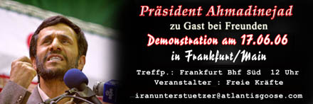 Von Nazis nicht für einen Krieg gegen den Iran einspannen lassen! Über die Rolle einer von Nazis angemeldeten Pro-Iran-Demo am 17.6.2006 in Frankfurt-Sachsenhausen Am 22.5.2006 erreichte uns eine eMail mit dem Betreff 'Iran-Solidarität: Nazis mobilisieren' von H.B. aus Frankfurt. Sie enthielt das folgende kurze Anschreiben sowie einen Aufruf mit Bild: Kleiner Vorschlag für eure Iran-Infoseite (weitergeleitet von: Anti-Nazi-Koordination Frankfurt) Mit freundlichen Grüßen aus "Jerusalem am Main" (s.u.) H.B. Aufruf 'Präsident Ahmadinedschad - Zu Gast bei Freunden - Solidrität mit dem Iran!':