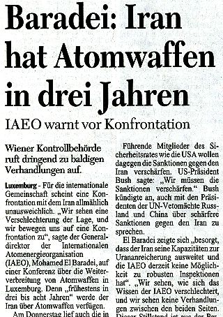 Desinformation im 'Kölner Stadt-Anzeiger' Äußerungen von Mohamed ElBaradei am 24.5.2007 in Sachen Iran AF, 29.5.2007 -- Am Freitag, 25.5.2007, prangt auf der Titelseite des 'Kölner Stadt-Anzeiger' die Schlagzeile "Baradei: Iran hat Atomwaffen in drei Jahren". Damit müssen die Leser annehmen, der Generaldirektor der Internationalen Atomenergieorganisation vertrete die Auffassung, der Iran entwickle Atomwaffen und werde in drei Jahren die Entwicklung soweit abgeschlossen haben, daß er über einsatzfähige Atomwaffen verfüge. Das ist unwahr. Leser werden in die Irre geführt. Es drängt sich der Verdacht auf, daß die Formulierung der Schlagzeile nicht der Unfähigkeit des verantwortlichen Redakteurs entspringt, sondern es sich um eine bewußte Verfälschung mit der Absicht der Desinformation handelt.