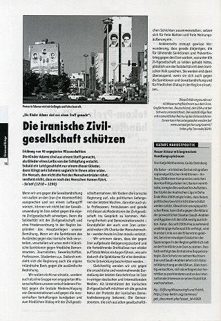 Es ist die Seite 14 der im Dezember 2009 erschienenen Ausgabe des "Friedensforum", der "Zeitschrift der Friedensbewegung", die sich mit dem Thema Iran befasst. Auf dieser Seite befinden sich zwei Artikel, eine "Erklärung von 40 engagierten Wissenschaftlern" mit dem Titel "Die iranische Zivilgesellschaft schützen" und ein kleinerer Artikel mit dem Titel "Katars Nahostpolitik". Erklärung der Friedensbewegung Die Erklärung "Die iranische Zivilgesellschaft schützen" erwähnt zwar - am Rande - die Bedrohung des Iran von außen, stellt aber die innenpolitische Situation im Iran in den Vordergrund der Betrachtung. Dabei werden Begriffe aus dem Vokabular des 'Westens' verwendet, z.B. 'Atomkonflikt' und 'freie Wahlen'. Und es ist von der "genuinen Natur der Proteste der iranischen Demokratiebewegung" die Rede. Mit der Verwendung des Begriffs 'Atomkonflikt' wird dem Iran das 'Streben' nach Atomwaffen unterstellt. Es gibt aber objektiv betrachtet keinen 'Atomkonflikt', denn erwiesenermaßen enthält die Atompolitik des Iran – ob der Einsatz von Atomenergie zu begrüßen ist oder nicht, ist eine andere Frage – nichts, was internationalen Verträgen zuwider laufen würde und damit unerlaubt wäre. Einen 'Atomkonflikt' gäbe es mit Israel. Der wäre real, wird aber nicht thematisiert. Mit der Forderung nach 'Freien Wahlen' wird auf die Präsidentschaftswahlen im Juni 2009 angespielt, und es wird unterstellt, die Wiederwahl Ahmadinedschads sei das Ergebnis von Wahlbetrug, wie es von den kapitalhörigen und auch von sich links nennenden Medien ohne jeden Beweis verbreitet worden ist. Mit der Formulierung "Als Unterstützer der iranischen Zivilgesellschaft möchten wir die genuine Natur der Proteste der iranischen Demokratiebewegung betonen" wird so getan, als gebe es die Destabilisierungsbestrebungen – insbesondere Israels und der USA – nicht. Und es wird offensichtlich davon ausgegangen, dass die Proteste berechtigt waren. Wesentlicher Auslöser für die Proteste war aber die Verbreitung des unbelegten Vorwurfs vom Wahlbetrug. Wenn es in diesem Zusammenhang in der Erklärung heißt "Gleichzeitig wenden wir uns gegen die unsachliche und vereinnahmende Darstellung der letzten Geschehnisse im Iran in einigen deutschen und internationalen Medien", können damit nur die wenigen Veröffentlichungen gemeint sein, die anerkennenswerterweise die Einflussnahme von außen und insbesondere das Operieren mit dem Vorwurf des Wahlbetrugs als Mittel zum Schüren von Unruhen thematisiert haben. Genau diese wenigen kritischen Stimmen werden durch die Erklärung diskreditiert. Das ist erschreckend. Das ist der gleiche Tenor, wie er aus dem offenen Brief des Mitunterzeichners Mohssen Massarrat vom 20.7.2009 spricht, in dem er einem Teil der Linken und ihren Medien "mangelnde Solidarität" mit dem "großartigen Widerstand der Menschen" im Iran vorwirft [1]. Die Erklärung "Die iranische Zivilgesellschaft schützen" verurteilt die Verhältnisse im Iran – mehr als die Sanktionen des Auslandes gegen das iranische Volk (wie es heißt). Es stellt sich die Frage, warum es der vom Krieg bedrohte Iran ist, der derart im Fokus der Betrachtung steht. Wie viele Staaten auf der Welt gibt es, deren innenpolitische Verhältnisse zu verurteilen wären und die trotzdem nur geringe Beachtung finden? Warum beispielsweise ist die von den USA 'geduldete' verheerende Menschenrechtssituation mit Millionen Binnenflüchtlingen und einer traumatisierten Bevölkerung in Kolumbien nicht annähernd vergleichbar im Bewusstsein der Weltöffentlichkeit? Wo bleibt hier der Sturm der Entrüstung? Es sind 40 Namen als Unterzeichner der Erklärung aufgeführt. Streng genommen sind es 41, denn teils wird Kai Hafez und teils Bettina Bouresh als Unterzeichner bzw. Unterzeichnerin angegeben. Es erscheint unvorstellbar, dass alle 41 UnterzeichnerInnen tatsächlich hinter der Erklärung stehen. Auf Nachfrage haben einige von ihnen Stellung bezogen. Einer der Unterzeichner sieht die Erklärung als Kompromiss und Zugeständnis an die bipolaren Diskursmuster, die implementiert werden (wer etwas gegen anti-iranische Hetze sagt, sei ein Freund der Regierung), sieht aber in der faktizierenden Bezeichnung 'Atomkonflikt' im nachhinein einen Fehler, der nicht hätte geschehen dürfen. Dagegen weist ein anderer Unterzeichner den westlichen Ursprung der Begriffe 'Atomkonflikt' und 'freie Wahlen' von sich. Ein weiterer Unterzeichner dagegen hat erkannt, dass auf die Opposition im Iran von außen – auch manipulativ – eingewirkt wurde und wird. Und er weiß, dass CIA, MI6 und Mossad ihre schmutzigen Finger im Spiel haben. Er sieht die Propaganda vom angeblichen Atomwaffenprogramm des Iran – wie sie in der Bezeichnung 'Atomkonflikt' zu Tage tritt – und die damit verbundene brennende Kriegsgefahr. Unterzeichnet hat er trotzdem, weil er die Forderungen nach Menschenrechten und Demokratie im Iran für berechtigt hält und er die Menschen im Iran nicht alleine lassen will. Die Aktivitäten der Geheimdienste würden ins Leere laufen, wenn es keine Demokratie- und Menschenrechtsdefizite im Iran gäbe. Des weiteren kamen folgende zwei Zuschriften von Unterzeichnern aus dem Bereich der Friedensbewegung: "Die Erkärung gibt ziemlich esxakt meine politische Meinung wieder, meins Sympathie gehört den Menschen, die für Demokratie und Freiheit gegen Unterdrückung – in welchem reaktiomnären Gewande auch immer – kämpfen. DSiktatoren verabscheue ich zutiefst." (Orthographie unverändert) Und: "Ja, diese Erklaerung habe ich mit voller Absicht unterschrieben. Vielleicht sollten wir sie noch mehr verbreiten. Manche Formulierungen sind mir sogar etwas zu schwach... Die antiimperialistische 'Linke' ausserhalb des Iran ist hier mal wieder aufgrund der eigenen 'Logik' auf dem falschen Trip. Der Ansatz 'der Feind meines Feindes ist mein Freund' ist einfach falsch. Das Gesundbeten von Achmadenijad ist sehr unappettitlich." Mohssen Massarrat, den wir schon vor Veröffentl