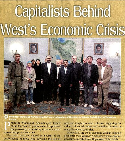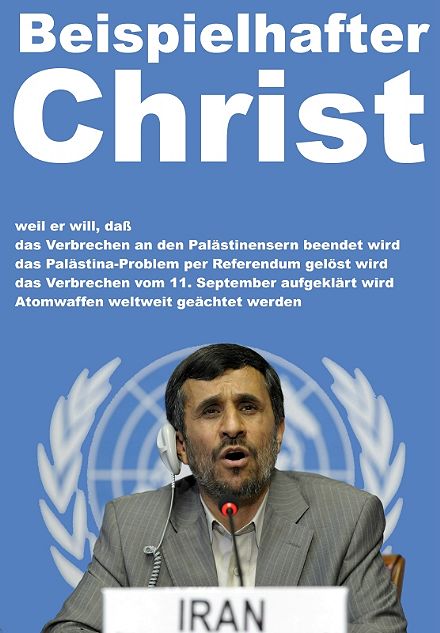Es sei ersichtlich, dass die Krise das Ergebnis derer ist, die immerwährend Kapital anhäufen und horten. Anstatt den Kapitalisten das durch Plünderung der einfachen Menschen angeeignete Vermögen zu entziehen und ihren rechtmäßigen Eigentümern zurückzugeben, würden die Kapitalisten weiter in die Taschen der Menschen greifen. Kein Unrecht sei größer als dieses. Die Regierung der USA begleiche ihre Haushaltsdefizite seit Jahren andauernd aus den Taschen anderer Nationen. Seit 1973 würden die USA der Weltwirtschaft im Durchschnitt jährlich 1.600 Milliarden Dollar von ihrem Defizit aufzwingen. Bis dato habe der Betrag die Marke von 32.000 Milliarden Dollar überschritten. Unter diesen Konditionen sei es kein Wunder, dass es weltweit mehr als drei Milliarden arme Menschen gebe. Den Unterstützern und Befürwortern des kapitalistischen Systems gehe es allesamt um die Erlangung von Macht, nicht um Menschlichkeit. Die werde unter den Füßen der Selbstsüchtigen zermalmt. Es werde aber die Zeit kommen, wo dieses System demontiert und damit auf der Basis von Nächstenliebe und Gerechtigkeit die Entfaltung der Begabungen und Talente der menschlichen Natur ermöglicht werde. Er gehe davon aus, dass der Tag, an dem allen Menschen ungeachtet ihrer Hautfarbe, Sprache oder Ethnie ihr Recht garantiert werde, sehr nah sei. Zwei Tage später überschrieb die englischsprachige Tageszeitung „Iran Daily“ einen Artikel, in dem von dem Treffen berichtet wurde, mit „Capitalists Behind West’s Economic Crisis“ (Kapitalisten verantwortlich für die Wirtschaftskrise des Westens). Ahmadinedschad erhält Ahmadinedschad-Poster Im Rahmen des Treffens erhielt der iranische Präsident ein Poster mit dem Titel „Beispielhafter Christ“, das im Sommer 2011 beim evangelischen Kirchentag in Dresden auf einem Stand der Arbeiterfotografie unter dem Motto „Die Rolle der Feindbilder - sie sind Teil der Kriege - wir nehmen sie unter die Lupe“ gezeigt worden war und dort zu erregten Diskussionen geführt hatte.