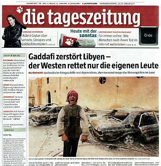 Am 10.3.2011 wird auf eine neue Weise an dem Feindbild Gaddafi gebaut. Al-Qaida kommt ins Spiel. Z.B. auf der Titelseite des Kölner Stadt-Anzeiger heißt es: "Libyens Diktator Muammar al-Gaddafi... droht... dem Westen an, einen Pakt mit El Kaida zu schließen...". Was es mit Al-Qaida auf sich hat, hat der für seine journalistische Tätigkeit vielmals ausgezeichnete Peter Scholl-Latour in der ARD-Sendung 'beckmann' am 28.2.2011 deutlich gemacht: "Es gibt kein Al-Qaida. Das ist ein Mythos... Al-Qaida ist ein Gespenst, das die Amerikaner großgezogen haben, um damit den übrigen Westen zu erschrecken." [7] Doch dem zum Trotz wird sogar in der 'jungen Welt' - die ansonsten in Sachen Libyen eine Ausnahme in der Medienlandschaft bildet - Al-Qaida als Realität dargestellt, allerdings in einer anderen Weise. Die Rede ist von der "zögerlichen Haltung" der USA gegenüber Libyen. Als Erklärung herangezogen wird ein Artikel in 'The Wall Street Journal' vom 8.2.2011, verfaßt von Richard Haass, "Chef der politisch einflußreichsten US-Denkfabrik 'The United States Atlantic Council'". Danach "liegt der eigentliche Grund für Washingtons Enthaltsamkeit bei Al-Qaida". Als müßten sich die USA vor ihrer eigenen Fiktion fürchten, wird ihre "zögerliche Haltung" hinsichtlich eines Angriffs auf Libyen insbesondere damit erklärt, daß die "von den USA gelieferte[n] Luftabwehrraketen für die libyschen Rebellen direkt in die Hände von Al-Qaida und anderen Gotteskriegern fallen" könnten. [8] Es ist immer wieder das gleiche durchschaubare Prinzip - die Agressoren bauen Feindbilder auf, indem sie die eigenen Verbrechen auf die Gegner projizieren: