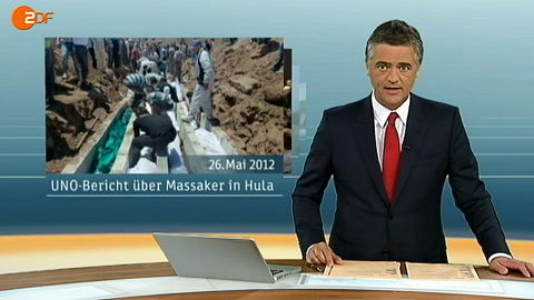 [07:18] Das Massaker von Houla belastete die Atmosphäre. UN-Ermittler legten ihre Untersuchungsergebnisse vor: weniger als 20 der 108 Toten seien durch schwere Waffen getötet worden, die anderen bei zwei getrennten Sammelhinrichtungen umgebracht worden. Es scheint, daß Schabiha-Milizen in Häuser eingedrungen sind und Menschen auf ganz abscheuliche Weise abgeschlachtet haben. Das Verbrechen ist am vergangenen Freitag [25.5.2012] verübt worden. Die Schabiha-Milizen, paramilitärische Trupps, unterstehen dem Geheimdienst Syriens, der von Assads Bruder kontrolliert wird. www.zdf.de/ZDFmediathek#/beitrag/video/1651942/ZDF-heute-Sendung-vom-29-Mai-2012 |