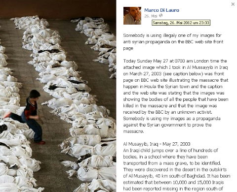 Marco di Lauro erklärte dazu Folgendes: „Was mich wirklich überrascht, ist, dass ein Nachrichtenunternehmen wie die BBC die Quellen nicht überprüft und bereit ist, irgendein Bild, das ihm von irgend jemandem geschickt wurde, zu veröffentlichen.... Jemand nutzt die Bilder von jemand anderem für gezielte Propaganda!“ [www.telegraph.co.uk] Der Sprecher der BBC sagte, dass das Bild, mit dem der Artikel „Das Massaker in Syrien wird verurteilt, während die Empörung wächst“ am Sonntagabend [27.5.2012] illustriert worden war, sofort entfernt worden sei, nachdem die echte Quelle identifiziert worden war.