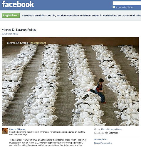 Für das „Versehen“ hatte man lediglich die Erklärung bereit, dass man dieses Bild, das weit herum im Internet zirkulierte, mit einem klaren Disclaimer (Haftungsausschluss) verwendet hätte und in diesem Zusammenhang darauf hingewiesen worden wäre, „dass es nicht von unabhängiger Seite überprüft worden sei!“. Fakt ist jedoch, dass die Informationen „die nicht von unabhängiger Seite überprüft werden können“ zum Markenzeichen der über 14 Monate dauernden Berichterstattung über Syrien geworden ist. (Quelle: Zeit-Fragen Nr.23, 29. Mai 2012, S.4) [www.zeit-fragen.ch] Und nicht nur das! Die Bundesregierung nutzte die Houla-Ereignisse dafür, der syrischen Regierung OHNE BEWEISLAGE VÖLKERRECHTSWIDRIGE AKTIONEN ANZULASTEN UND DEN SYRISCHEN BOTSCHAFTER IN DEUTSCHLAND AUSZUWEISEN!!! Dazu muss noch Folgendes angemerkt werden: Völkerrechtswidrige Angriffskriege der NATO-Staaten sind seit dem NATO-Bombardement auf Jugoslawien im Jahre 1999 zur Regel geworden. Um einen militärischen Angriff der Westmächte (NATO) mit gezieltem Sturz antiimperialistischer Regierungen wie in Jugoslawien, dem Irak, und Libyen vor den Augen der Weltöffentlichkeit zu rechtfertigen, gebrauchten diese immer ein einschneidendes, erschütterndes Ereignis, das einen militärischen Rachefeldzug „rechtfertigen“ sollte! Im Falle Syriens soll nun wohl der Massenmord in Houla dafür herhalten, die Weltöffentlichkeit auf einen notwendigen Militäreinsatz von UN- bzw. NATO-Truppen einzustimmen. Werner Pirker urteilt in der jungen Welt vom 29.5.2012 unter „Cui bono? Parteiische UN-Erklärung zu Syrien“, dass das Houla-Massaker als Vorwand für ein vom Westen seit langem gewünschtes militärisches Eingreifen der NATO dienen könnte. [www.jungewelt.de] Er meinte, dass die Behauptung der westlichen Regierungen, syrische Regierungstruppen hätten ihre eigene Zivilbevölkerung durch Panzer- und Artilleriebeschuss ermordet, unsinnig sei, wisse doch die syrische Regierung genau, dass der Westen seit langem nach einem Grund für ein militärisches Eingreifen in Syrien gesucht hat und ihnen folglich niemals selbst den geeigneten Anlass geliefert hätte!! Unbewusst haben die ZDF-Nachrichten am 29.5.2012, 19.00 Uhr, dazu ein wesentliches Detail dieses Massakers in Houla verraten, indem sie berichteten, DIE MEISTEN OPFER IN HOULA SEIEN NICHT DURCH ARTILLERIE- UND PANZERBESCHUSSS (die die Westpresse den syrischen Regierungstruppen vorwarf!) SONDERN DURCH EINSATZKOMMANDOS ZIELGERICHTET GETÖTET WORDEN!! [www.zdf.de] Dass NATO-Soldaten aus verschiedenen Ländern schon seit Monaten in Syrien operieren und militärische Aktionen mit Panzer-brechenden Waffen und Mörsergranaten auf Seiten der syrischen Opposition ausführen, bewiesen u.a. auch die Ereignisse in Homes, bei der von syrischen Regierungstruppen ausländische, bis an die Zähne bewaffnete Soldaten festgenommen und die modernste US-Ausrüstung mit Waffen und Munition sichergestellt worden ist. Die gesamte konzertierte Aktion in Syrien wurde - wie in Libyen u.a. Ländern auch - genau vorbereitet und zwar mit Geldern der US- und internationalen Finanzoligarchie über spezielle international agierende Nichtregierungsorganisationen (auch OTPOR, wie im damaligen Jugoslawien) und durch im Dienste der NATO stehende militärisch agierende Söldnertruppen, die überall in der Welt dahin geschickt werden, wo man sie „braucht“. (Quellen: GEO TV, Focus News Agency, 13.5.2012 „Russland warnt Kosovo vor der Ausbildung syrischer Rebellen“) [www.zeit-fragen.ch] Auch dass sich in die ideologische Vorbereitung von NATO-Angriffskriegen sogen. Kommunisten, die vor Jahren vor ihren Regierungen ins Ausland geflüchtet sind, einbinden lassen, ist leider keine Seltenheit! So hatte damals im Jahre 2003 vor dem Irak-Krieg ein Vertreter der Kommunistischen Partei des Irak, R. Ghewielib, im ND-Interview vom 04.08.2007 erklärt: „Nur wenn es ... den zivilgesellschaftlichen Organisationen... gelingt, durch gewaltfreies politisches Agieren einen neuen demokratischen föderalen Irak aufzubauen, kann das Land insgesamt zu Stabilität und Sicherheit gelangen“. Damit suggerierte er, die USA hätten den Irak einzig und allein zu dem Zweck überfallen, um Saddam Hussein zu stürzen und Demokratie ins Land zu bringen!! Nunmehr vertritt auch ein Teil der Kommunistischen Partei Syriens, die ebenso vom Ausland gelenkt wird, die Meinung, dass die Auseinandersetzungen in Syrien zu ihren Gunsten ausgehen werden! So argumentiert der syrische Publizist Michel Kilo, der teils als Kommunist ausgegeben wird, dass das Ziel seiner Demokratischen Plattform sei, „einen politischen Plan für die Volksbewegung zu entwickeln und Syrien zu einem ausgeglichenen, demokratischen System zu führen“. Er erklärt ferner: „Wir haben einen Hauptfeind, das Regime. Und wenn das Regime weg ist, dann können wir unsere Streitigkeiten regeln!“ Diese Äußerungen – als hätte es in Syrien nicht kürzlich Wahlen gegeben – zeigen, dass auch die sogen. Demokratische Plattform gemeinsames Spiel mit den Westmächten macht. (siehe: ND, 29.5.2012, S.2 „Die UNO-Mission ist unsere große Chance“) [www.neues-deutschland.de] Übrigens ist in Syrien im Gegensatz zu manchen, sich jetzt als Demokratie aufspielenden westlichen Staaten, einschließlich den USA, Großbritannien oder der BRD, die KOMMUNISTISCHE PARTEI IN DER SYRISCHEN REGIERUNG VERTRETEN UND STEHT HINTER DEM PRÄSIDENTEN ASSAD!! Anhang: Es ist nicht klar, wann das von der BBC fälschlich verwendete Bild tatsächlich entstanden ist. Im 'The Telegraph' ist der 27.3.2003 angegeben [www.telegraph.co.uk]. Auf der Facebook-Seite des Fotografen Marco Di Lauro ist zum einen auch dieses Datum angegeben, aber in der dort aufgeführten Bildunterschrift der 27.5.2003 [www.facebook.com].