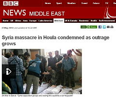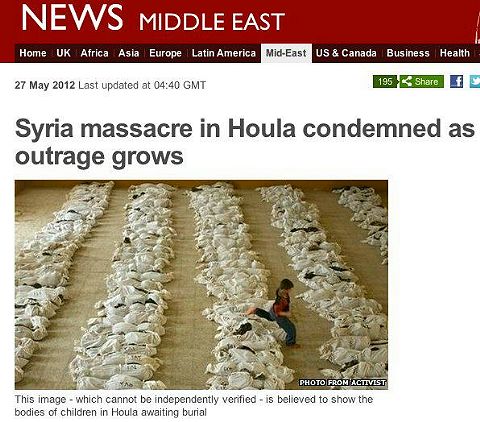 Syrien - Houla, False-Flag-Operation und ein falsches Foto Brigitte Queck und Dr. Hans-Jürgen Falkenhagen über das Massaker von Houla - 31.5.2012 Die Schweizer Zeitung Zeit-Fragen stellt in ihrer Ausgabe vom 29.05.2012 in Zusammenhang mit dem Massaker in Houla (Syrien), das von westlichen Medien ohne jegliche Untersuchung sofort den syrischen Regierungstruppen gegen ihre eigenen Zivilisten zugeschrieben wurde, in einem Artikel mit dem Titel „Irak-Photo vom 27. März 2003 soll jetzt in Houla gewesen sein?“ [www.zeit-fragen.ch] klar, dass das von der BBC [www.bbc.co.uk] verwendete Foto verfälschend eingesetzt war.