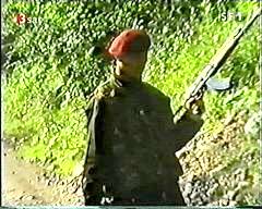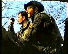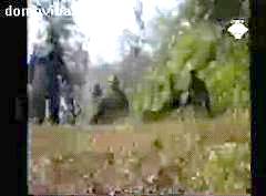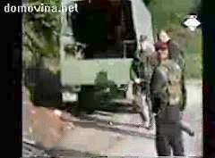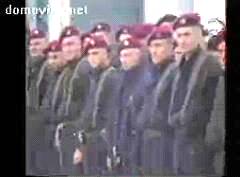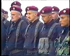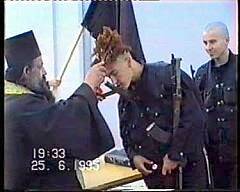 Anmerkung: Inwiefern diese Szene etwas mit der behaupteten Erschießung zu tun hat, ist nicht ersichtlich. Wenn die Zeiteinblendung stimmt, hat sich die 'Segnung' ca. zwei Wochen vor dem Einmarsch der bosnisch-serbischen Truppen in das Gebiet von Srebrenica abgespielt. Ob auf dem Bild ein Mitglied der so genannten Skorpione zu sehen ist, läßt sich nicht erkennen. |