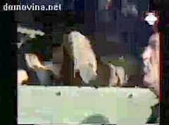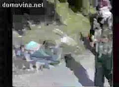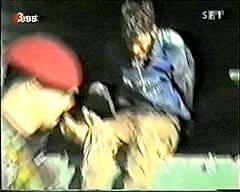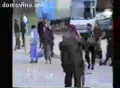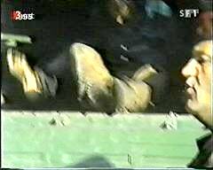 Anmerkung: Diese Szene ist mit extrem unruhiger Kamera aufgenommen. Es scheint sich, soweit das bei den schnellen Kamarabewegungen zu beurteilen ist, um eine durchgehende Einstellung zu handeln. Es sind wiederholt Schüsse zu hören, allerdings ohne daß im jeweiligen Moment eine Waffe zu sehen ist. Zumindest in einem Fall ist zu erkennen, wie eine Person in sich zusammensinkt. Der Körper verschwindet allerdings nach unten aus dem Blickfeld der Kamera. Die am Boden liegende Person ist erst zu sehen, nachdem die Kamera Bewegungen in andere Richtungen vollzogen hat. |