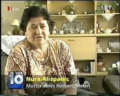 Nura Alispahic (übersetzt): In der Ansage hieß es, daß einige Mütter ihren Sohn erkennen würden, Schwestern ihre Brüder. Dann zeigten sie vier Männer, dann töteten sie diese. Dann brachten sie zwei andere Männer und sagten: weg mit ihnen. Das war mein Sohn und noch ein anderer Mann. Sie töteten zuerst den anderen. Mein Sohn drehte sich um, als würde er Hilfe suchen.