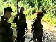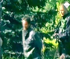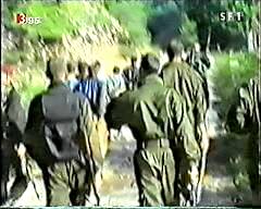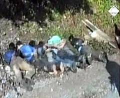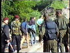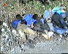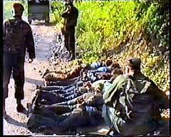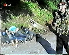 - "In the video, six young Muslim men, hands tied behind them, are taken from the back of a military truck as the paramilitary group called the Scorpions taunted and insulted them. They were pushed facedown into the slope of a hill as a shot was fired over them, and were then escorted down an unpaved mountain road to a clearing and casually executed. -- In dem Video werden sechs junge muslimische Männer, die Hände hinter sich zusammengebunden, von der Rückseite eines Militärfahrzeugs genommen, während die paramilitärische Gruppe, Skorpione genannt, sie verhöhnen und beleidigt. Sie werden, das Gesicht nach unten, in die Böschung eines Bergs gestoßen, als ein Schuß über ihnen abgefeuert wird, dann eine ungepflasterte Bergstraße zu einer Lichtung hinabgeleitet und beiläufig hingerichtet." (CNN, 4.6.2005, Korrespondentin Fionnuala Sweeney)
