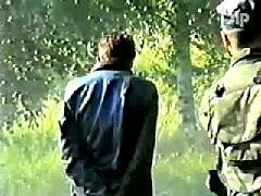 | Sprecher: Sechs Männer müssen aus einem Lastwagen steigen und sich in einem Graben am Straßenrand legen. Ihre Hände sind zusammengebunden.
