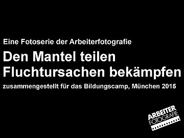 Meine Zeit – Meine Welt – Meine Perspektive Arbeiterfotografie beim Bildungscamp, München, 15.-21.6.2015 Als sich die Vereinigung der Arbeiterfotografen Deutschlands (VdAFD) 1927 in Erfurt gründete, war der Anlass, Bilder aus dem unmittelbaren Lebens- und Arbeitsumfeld und der politischen Betätigung gegen den aufkommenden NS-Staat zu schaffen, die keine bürgerliche Bildagentur liefern konnte (oder wollte). Wertvolle Zeitdokumente sind aus dieser Phase erhalten, u.a. die Fotomontagen des John Heartfield (eigentlich Helmut Herzfelde), der brisante Themen der "Führer-Riege" sarkastisch und bis in die heutige Zeit entwaffnend im Bild, in der Fotomontage inszenierte (Hitler: Millionen stehen hinter mir. Gemeint sind Geldgeber...) Schlüssel-Reportagen der "Neuzeit" – seit der Neugründung – des Bundesverbandes Arbeiterfotografie 1978 sind die erste Kriegsbeteiligung Deutschlands im so genannten Kosovo-Konflikt 1999, sind die Niederschlagung der Proteste von Genua 2001, die Gipfel-Reportage von Rostock und Heiligendamm 2007, unzählige Reportagen von sozialen Protesten, Flüchtlingsschicksale... Im Programm der Galerie der Arbeiterfotografie nimmt der US-amerikanische Sozialfotograf Lewis W. Hine mit seinem fotografischen Werk für das NCLC – National Child Labor Comittee – eine herausragende Bedeutung ein. Das Komitee bediente sich der Fotografie, um die Gesellschaft für die Missstände zu sensibilisieren, die das Schicksal tausender Minderjähriger beinhaltete: wer hat den Nutzen (der Unternehmer...) wer den Schaden (die Individuen – Kinder und Jugendliche – und die Gesellschaft...) Wenn der Verband heute Jugendliche dazu aufruft, ihre Perspektive "Meine Zeit – Meine Welt" mit Fotos (Selfies, ...), Montagen, Kurzfilmen ins Bild zu setzen, entspricht dies zutiefst dem Gründungsgedanken der ArbeiterfotografInnen-Vereinigung der Weimarer Republik. Macht mit! ![]() Exponat zum Jugendprojekt "Meine Zeit - Meine Welt" (2 x 3 Meter) ![]() Exponat aus der Ausstellung "Lewis Hine: NCLC - Kinderarbeit in Fotografien von 1908 bis 1924" der Galerie Arbeiterfotografie (2 x 3 Meter) Projektion zum Thema Flüchtlinge ![]() ![]() ![]() ![]() ![]() ![]() ![]() ![]() ![]() ![]() ![]() ![]() ![]() ![]() ![]() ![]() ![]() ![]() ![]() ![]() ![]() ![]() ![]() ![]() ![]() ![]() ![]() ![]() Bildungscamp-website: http://bildungscamp.org/ |